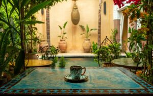 Le carrelage marocain coloré qui recouvre le sol ajoute une touche de vie et de dynamisme à la chambre, tandis que les tables marocaines incrustées sont un exemple de l'artisanat local. La chambre dispose d'une fenêtre traditionnelle en arc qui laisse entrer la lumière naturelle et offre une vue sur la cour intérieure du Riad. C'est la chambre la plus cosy pour vous détendre après une journée de visite de la ville. Pour vivre une expérience chaleureuse et confortable, réservez la chambre Kasbah.