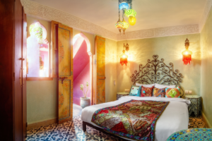 Pour ajouter une touche de dynamisme et de vie à la pièce, des tables marocaines incrustées sont disposées à différents endroits de la chambre. La fenêtre en arc traditionnelle laisse pénétrer une belle lumière naturelle dans la chambre, ce qui lui donne une ambiance confortable et apaisante. La chambre Mellah est idéale pour ceux qui cherchent à passer des moments intimes avec leurs proches. Si vous voulez vous immerger dans une ambiance chaleureuse et confortable, la chambre Mellah est l'endroit parfait pour vous.