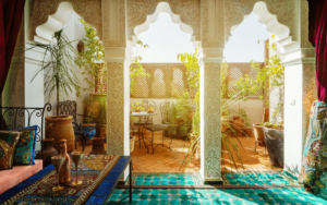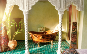 It takes its inspiration both from the Romantic Casablanca we know from cinema. And also from the real bustling, luxurious, international Casablanca of today. Pale green tadelakt walls mesh with dark green zellige floor tiles. These colors are set off by the stark white of traditional carved plaster columns and an enormous copper bathtub. Glass doors open fully on to your large, fully private terrace where you can have secluded dinners in the shade of the fruit trees that grow in the courtyard of the Casablanca Room. For those intimate conversations, book the Casablanca room!